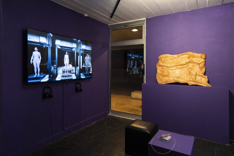 Lizardians is a 3-D animation short that depicts a reality in which a technology that applies the axolotl salamander’s genetic powers of regeneration to the human body has been commercialized for mass consumption. Beyond neoliberalism and cognitive capitalism, Lizardians is set in a biocapitalist factory where conflict arises between protagonists from different classes as they question the value of labor, creativity, agency, and authorship. Each of the three channels embodies part of the story, like limbs to a whole: a regenerator (Lizardian), a janitor, and the RENEW corporation itself. Shelby endures pain, immobility, and isolation in order to perform her job of regrowing her limbs, while Caleb works in the disposal department of the factory and in his spare time salvages defective human limbs to make art. As he develops a following on social media and begins to sell artwork made of company property, RENEW intervenes. Shelby and Caleb’s synchronous yet contrasting lives unfold separately until all three channels merge as they meet at the opening reception of Caleb’s exhibition featuring sculptures made with some of Shelby’s body parts.