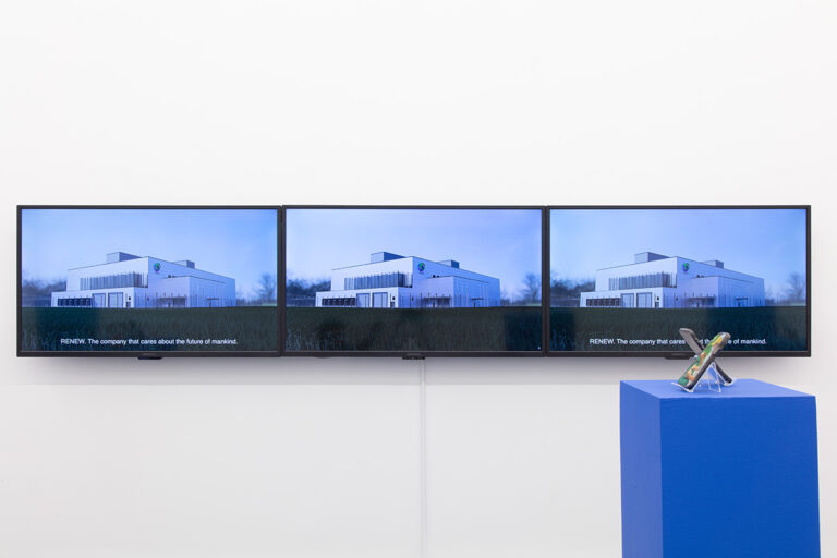 Lizardians is a 3-D animation short that depicts a reality in which a technology that applies the axolotl salamander’s genetic powers of regeneration to the human body has been commercialized for mass consumption. Beyond neoliberalism and cognitive capitalism, Lizardians is set in a biocapitalist factory where conflict arises between protagonists from different classes as they question the value of labor, creativity, agency, and authorship. Each of the three channels embodies part of the story, like limbs to a whole: a regenerator (Lizardian), a janitor, and the RENEW corporation itself. Shelby endures pain, immobility, and isolation in order to perform her job of regrowing her limbs, while Caleb works in the disposal department of the factory and in his spare time salvages defective human limbs to make art. As he develops a following on social media and begins to sell artwork made of company property, RENEW intervenes. Shelby and Caleb’s synchronous yet contrasting lives unfold separately until all three channels merge as they meet at the opening reception of Caleb’s exhibition featuring sculptures made with some of Shelby’s body parts.